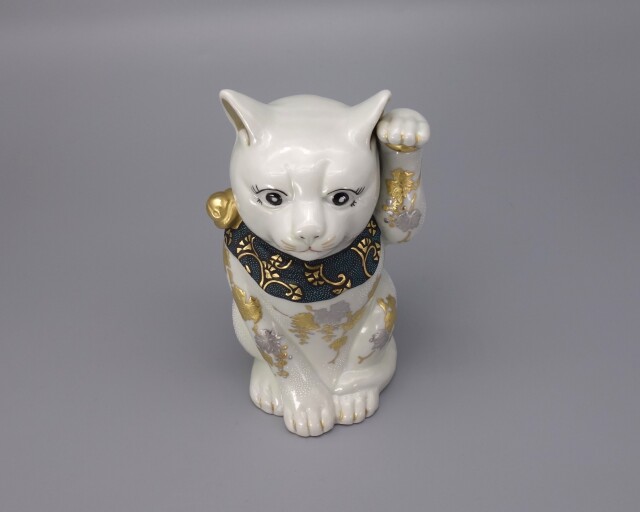 渦打青粒の名手 [ 三代 仲田錦玉 ] によって仕上げられた「招猫」の置物です。 型で制作された素地に白地を施し、「葡萄」を金盛と白金(プラチナ)で描き、それらを引き立たせるように渦打青白粒を絶妙なバランスで配しております。 また、左手を挙げており「人(お客様)を招く」と言われております。 縁起の良い 正に逸品です。 付属品 台・木札