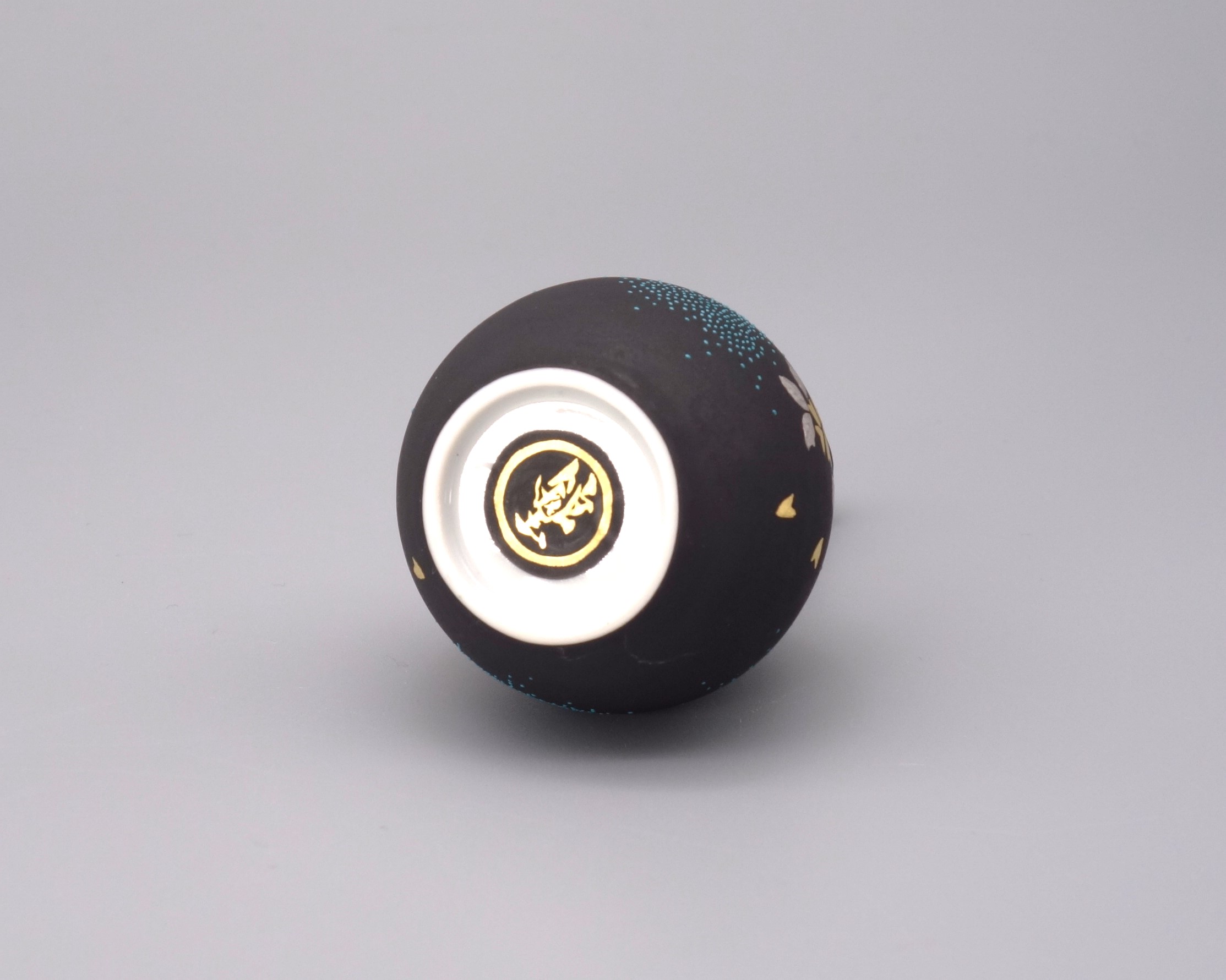 丁寧にロクロで成形した素地に朱地を施し、白金盛(プラチナ)で「枝垂桜」をあしらっております。またその「枝垂桜」を引き立たせるように渦打青粒を絶妙なバランスで配しております。 小ぶりな大きさが可愛らしい逸品です。