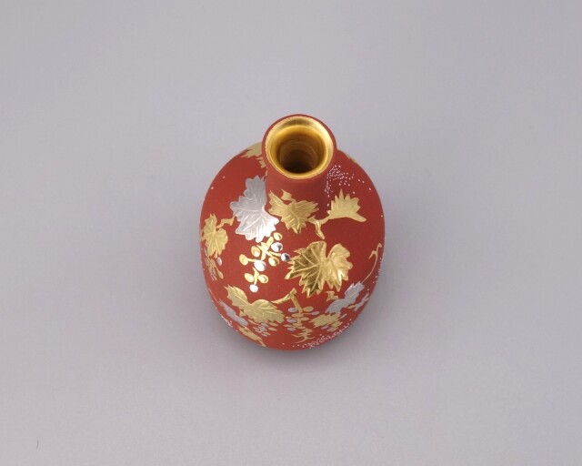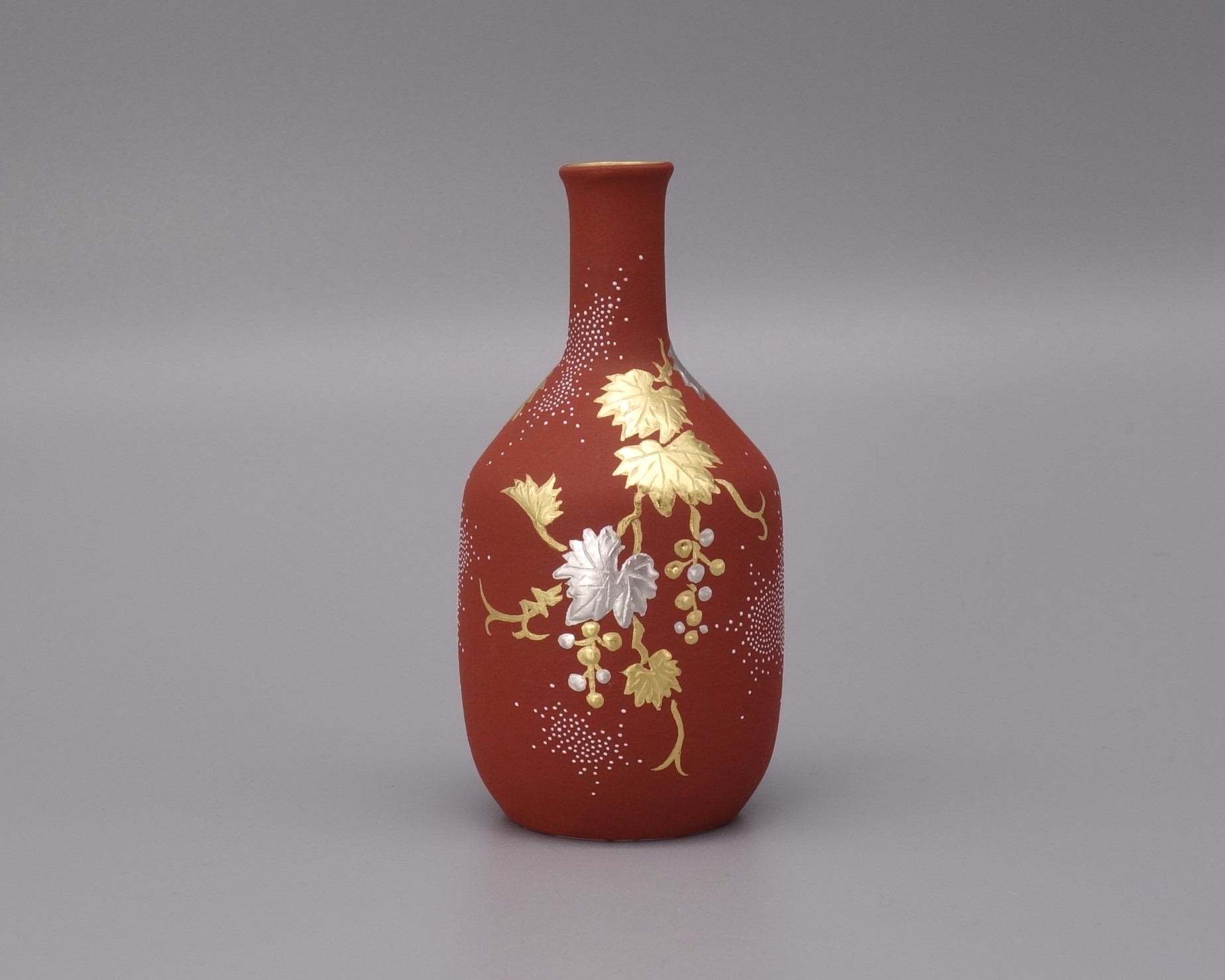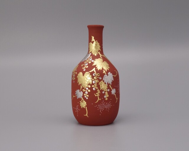 今回の作品は、丁寧にロクロで成形した素地(ボトル形)に朱地を施し、白金盛(プラチナ)で「葡萄図」をあしらっております。またその「葡萄図」を引き立たせるように渦打白粒を絶妙なバランスで配しております。 小ぶりな大きさが可愛らしい逸品です。