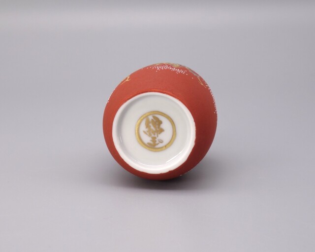 渦打青粒の名手【仲田錦玉】によって仕上げられた小さい「花入」です。 今回の作品は、丁寧にロクロで成形した素地(ボトル形)に朱地を施し、白金盛(プラチナ)で「葡萄図」をあしらっております。またその「葡萄図」を引き立たせるように渦打白粒を絶妙なバランスで配しております。 小ぶりな大きさが可愛らしい逸品です。