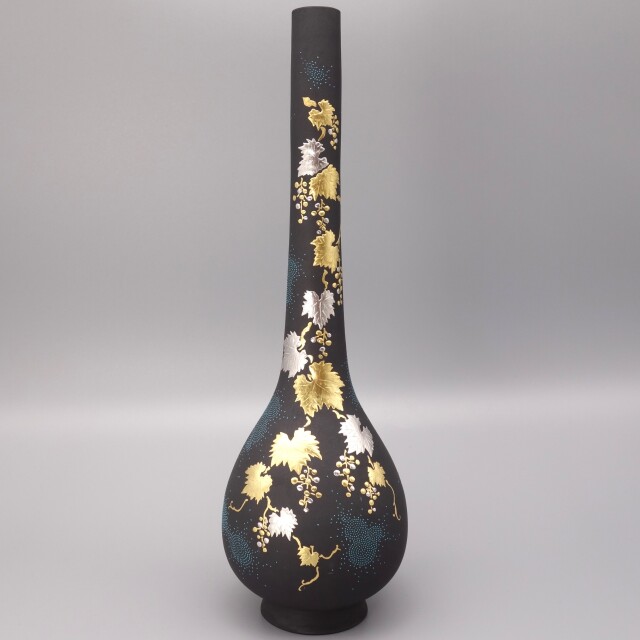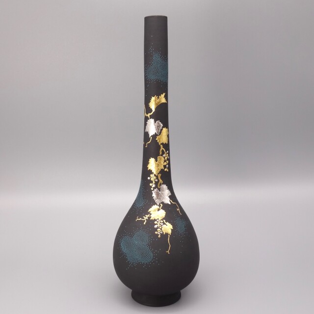 渦打青粒の名手【仲田錦玉】によって仕上げられた小さい「9号花瓶(鶴首)」です。 今回の作品は、丁寧にロクロで成形した素地に青地を施し、白金盛(プラチナ)で「葡萄」をあしらっております。またその「葡萄」を引き立たせるように渦打青粒を絶妙なバランスで配しております。 細身のシルエットがお洒落な逸品です。
