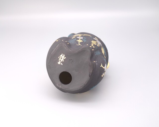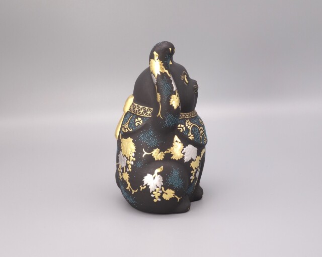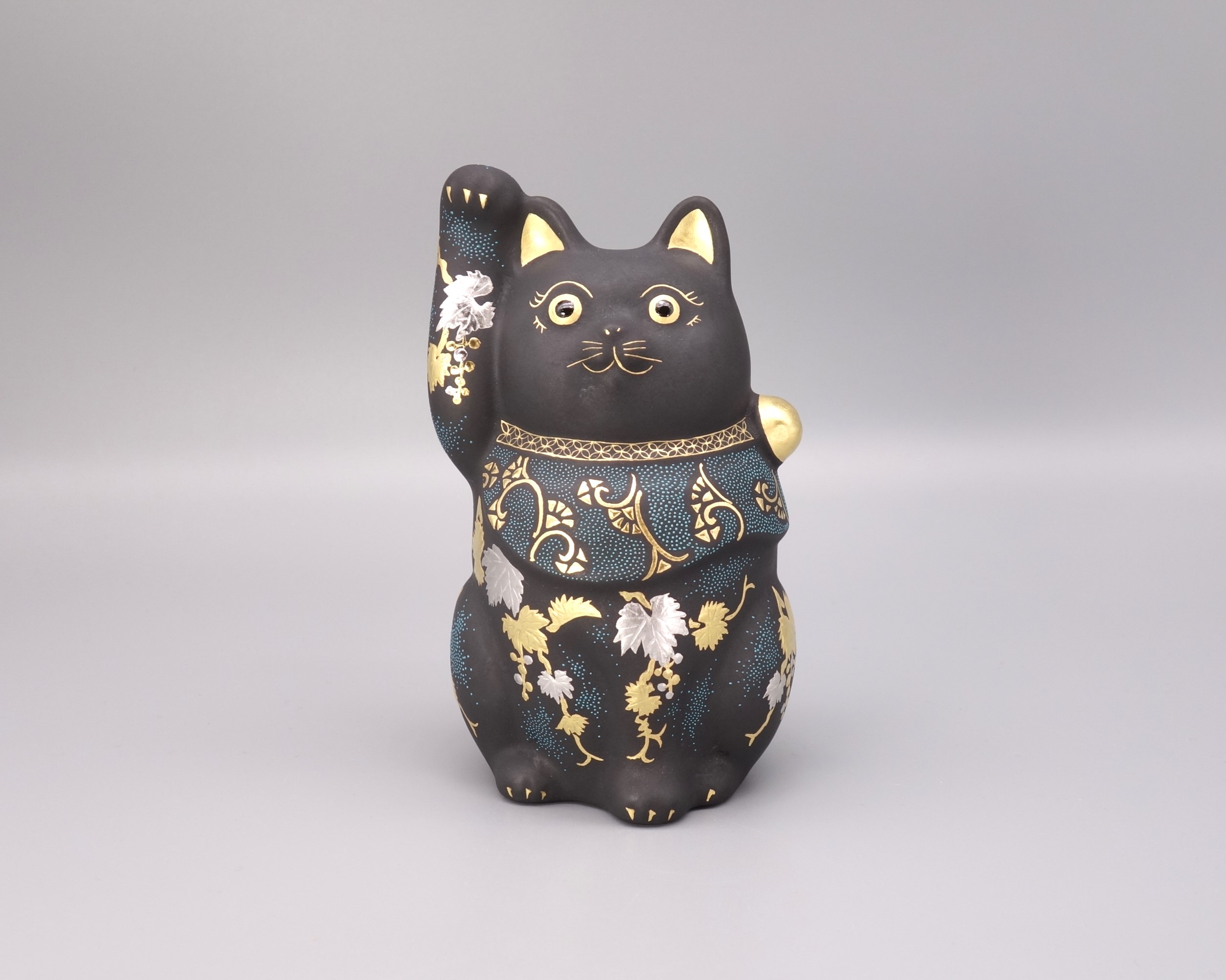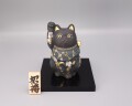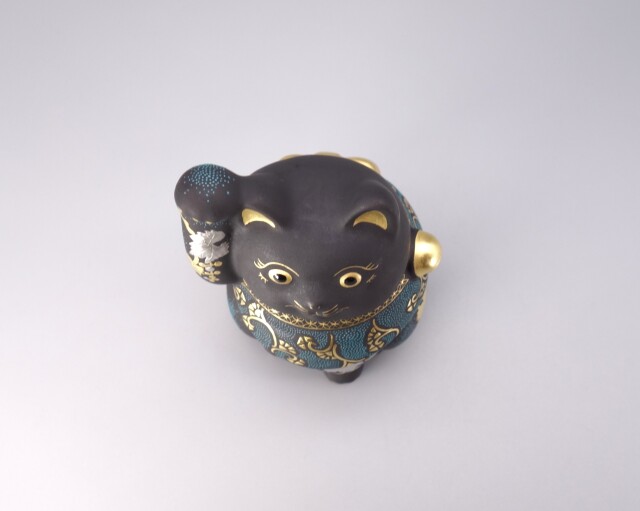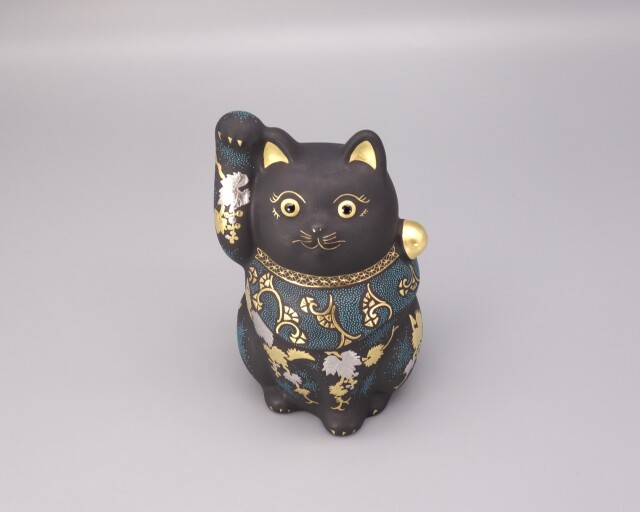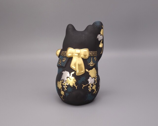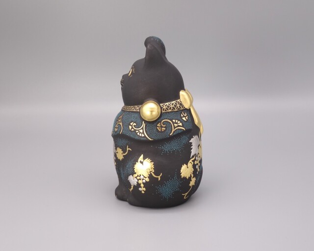 渦打青粒の名手 [ 三代 仲田錦玉 ] によって仕上げられた4.8号(高さ14cm)「招猫」です。 型で制作された素地に青黒地を施し、「葡萄」を金盛と白金(プラチナ)で描き、それらを引き立たせるように渦打青粒を絶妙なバランスで配しております。 また、右手を挙げており「金運・幸運を招く」と言われております。同じ形状で朱地もございます、並べて置くのもGOOD!! 縁起の良い 正に逸品です。 付属品 台・木札