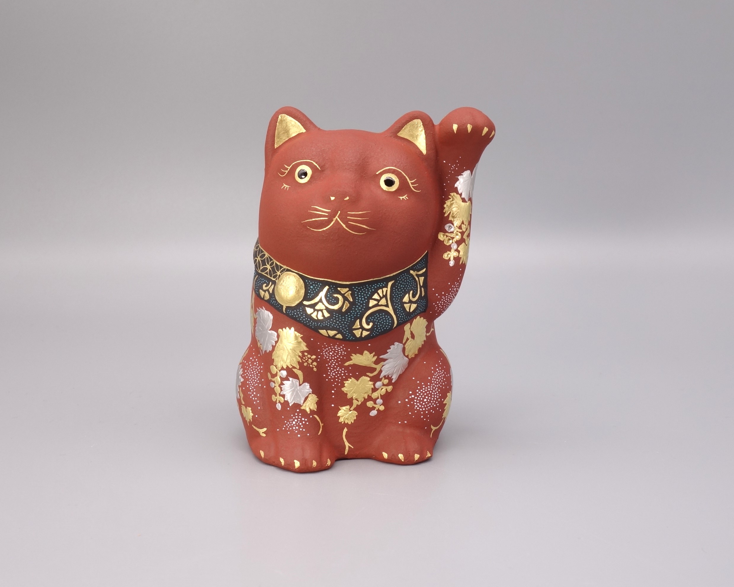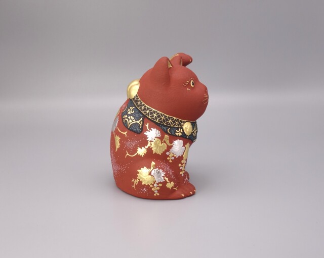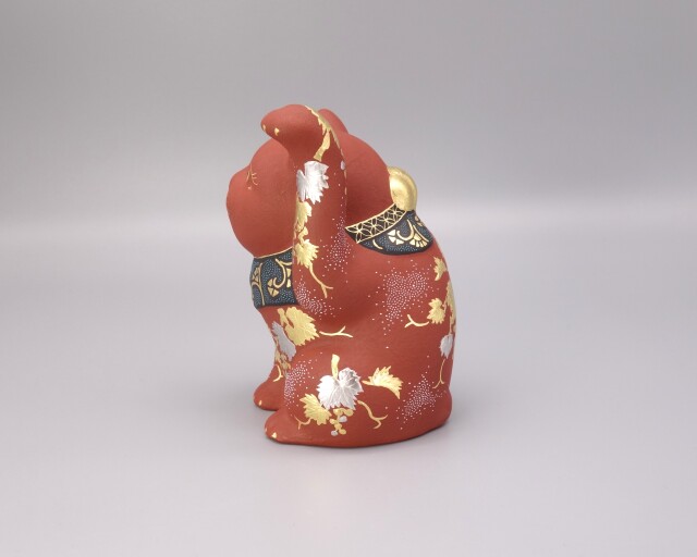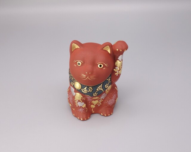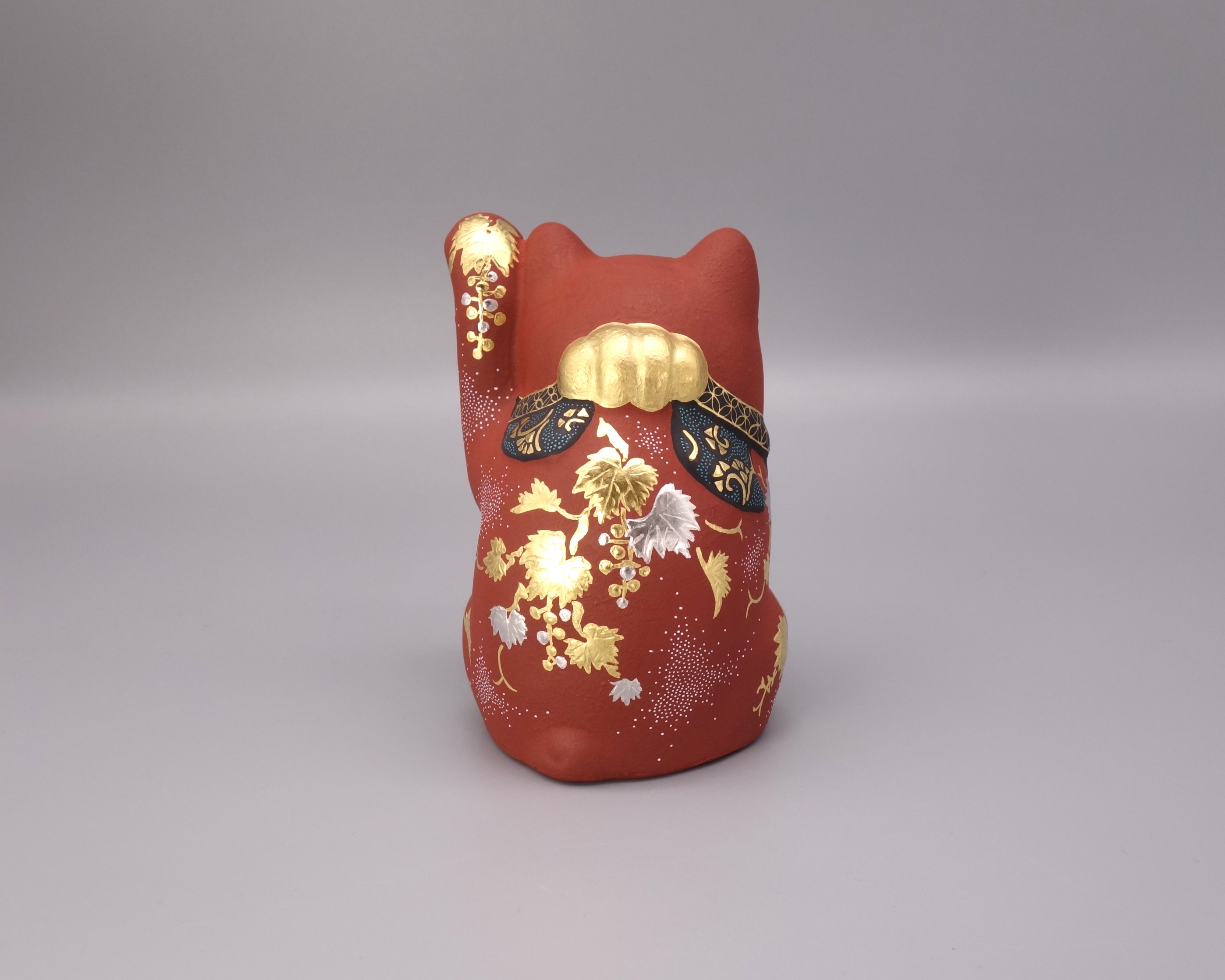 渦打青粒の名手 [ 三代 仲田錦玉 ] によって仕上げられた3.8号(高さ11.5cm)「招猫」です。 型で制作された素地に朱地の下地を2度3度と施し、「葡萄」を金盛と白金(プラチナ)で描き、それらを引き立たせるように渦打白粒を絶妙なバランスで配しております。 また、左手を挙げており「人運・お客様を招く」と言われております。同じ形状で朱地もございます、並べて置くのもGOOD!! 縁起の良い 正に逸品です。 付属品 台・木札