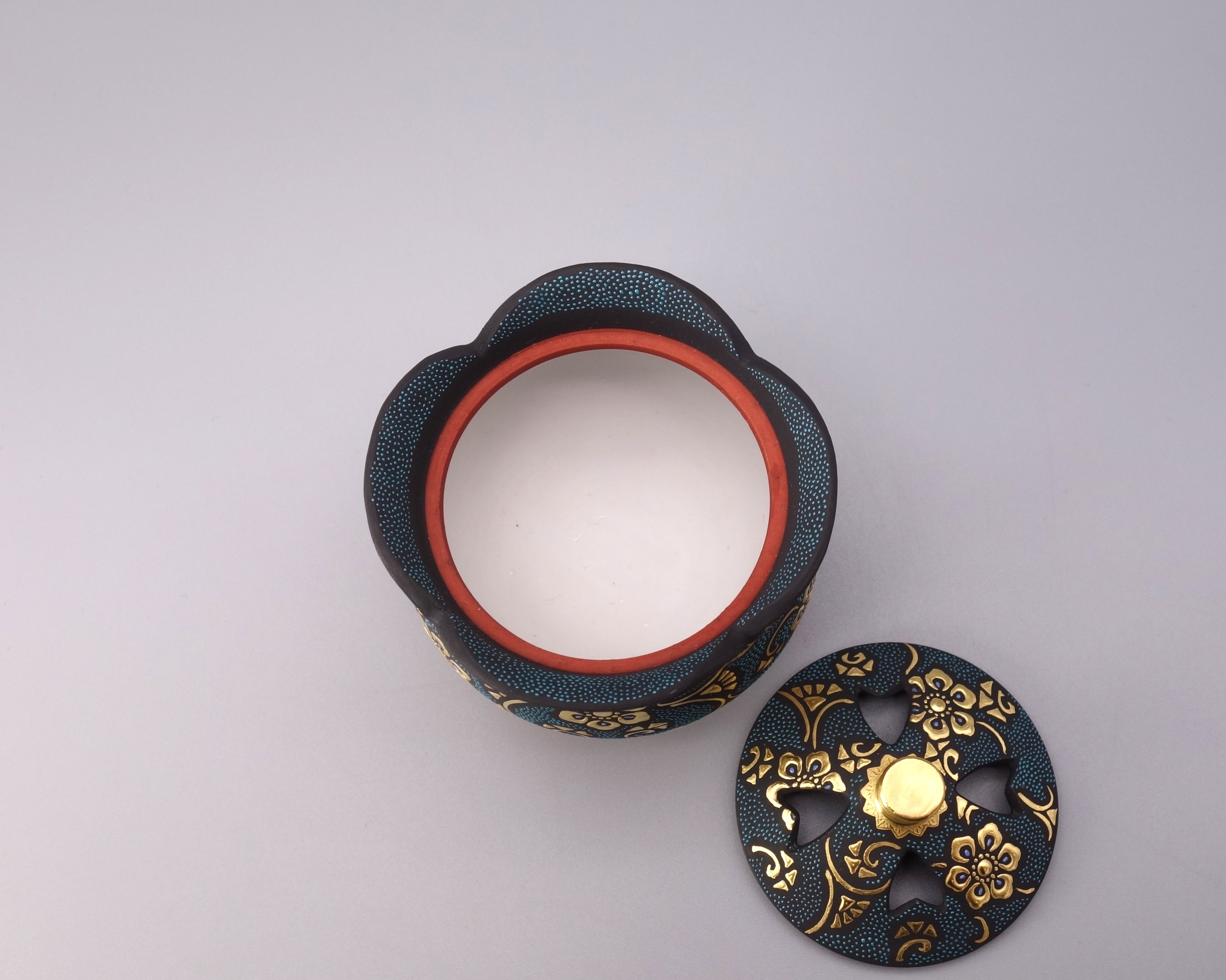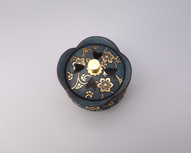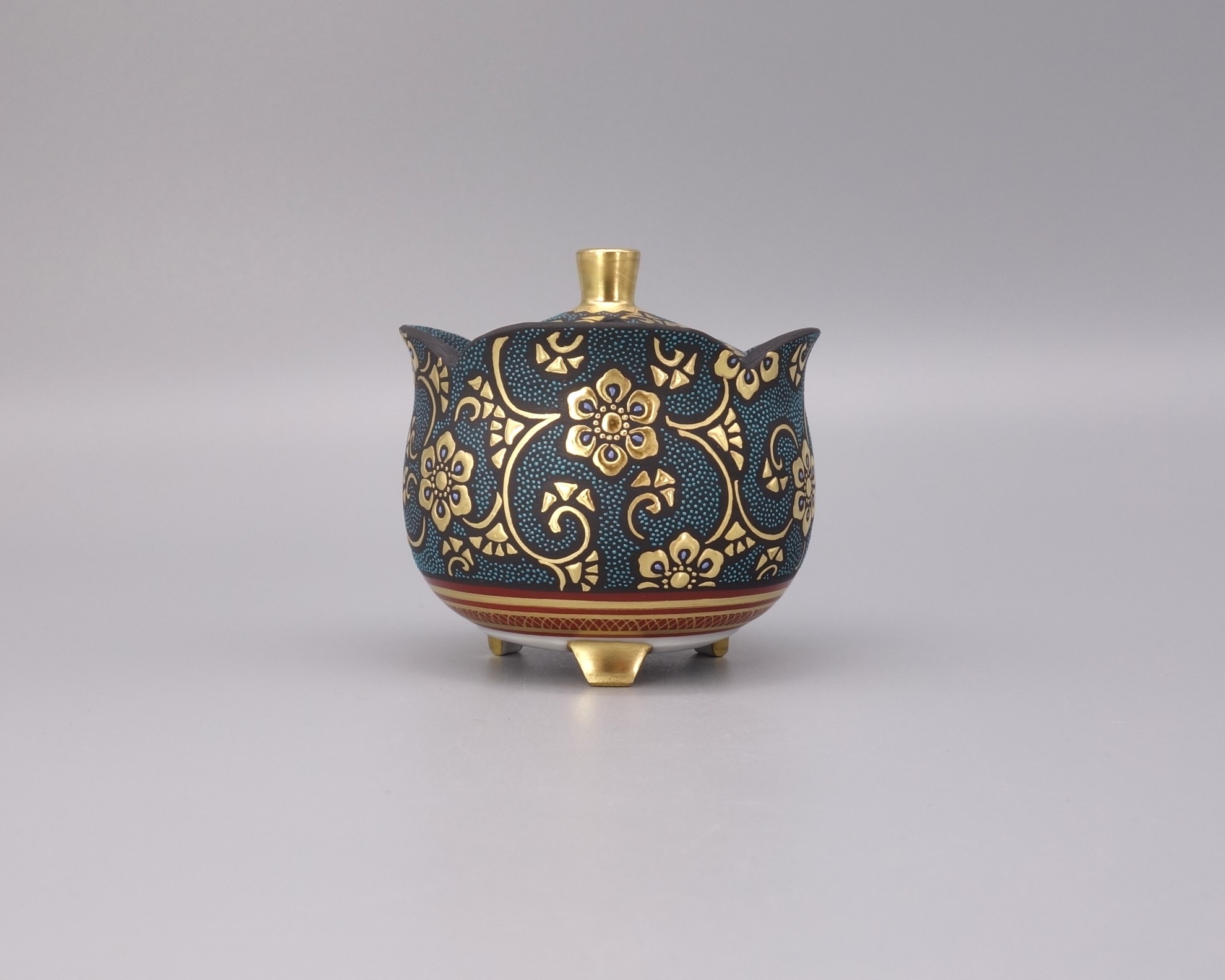 | 製品名: | 香炉(2.3号花形) 渦打青粒盛金宝相華唐草図 [桐箱入] |