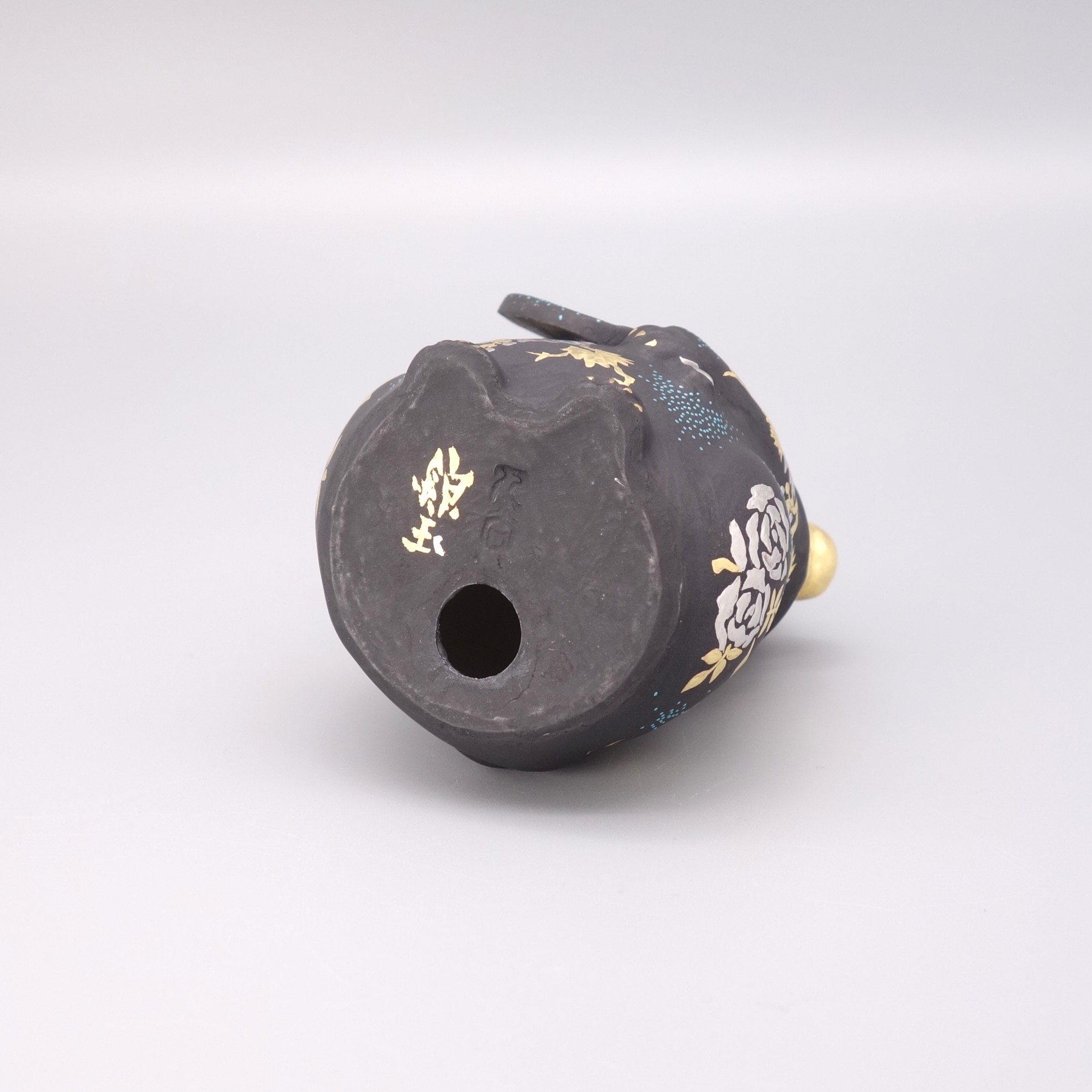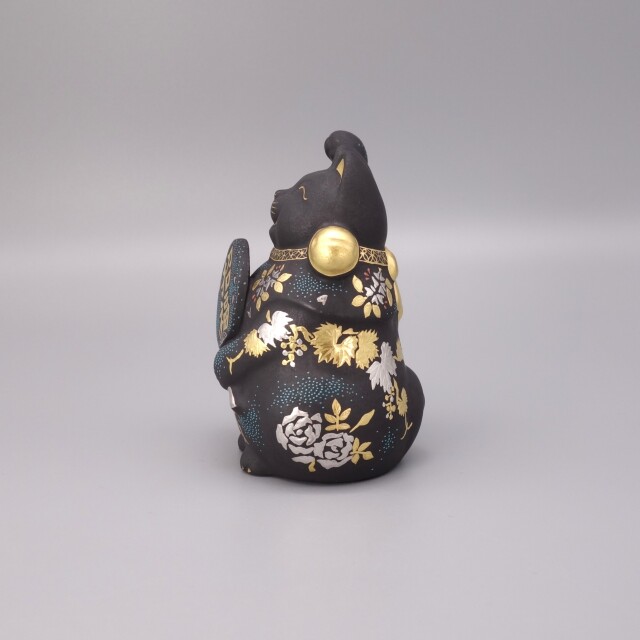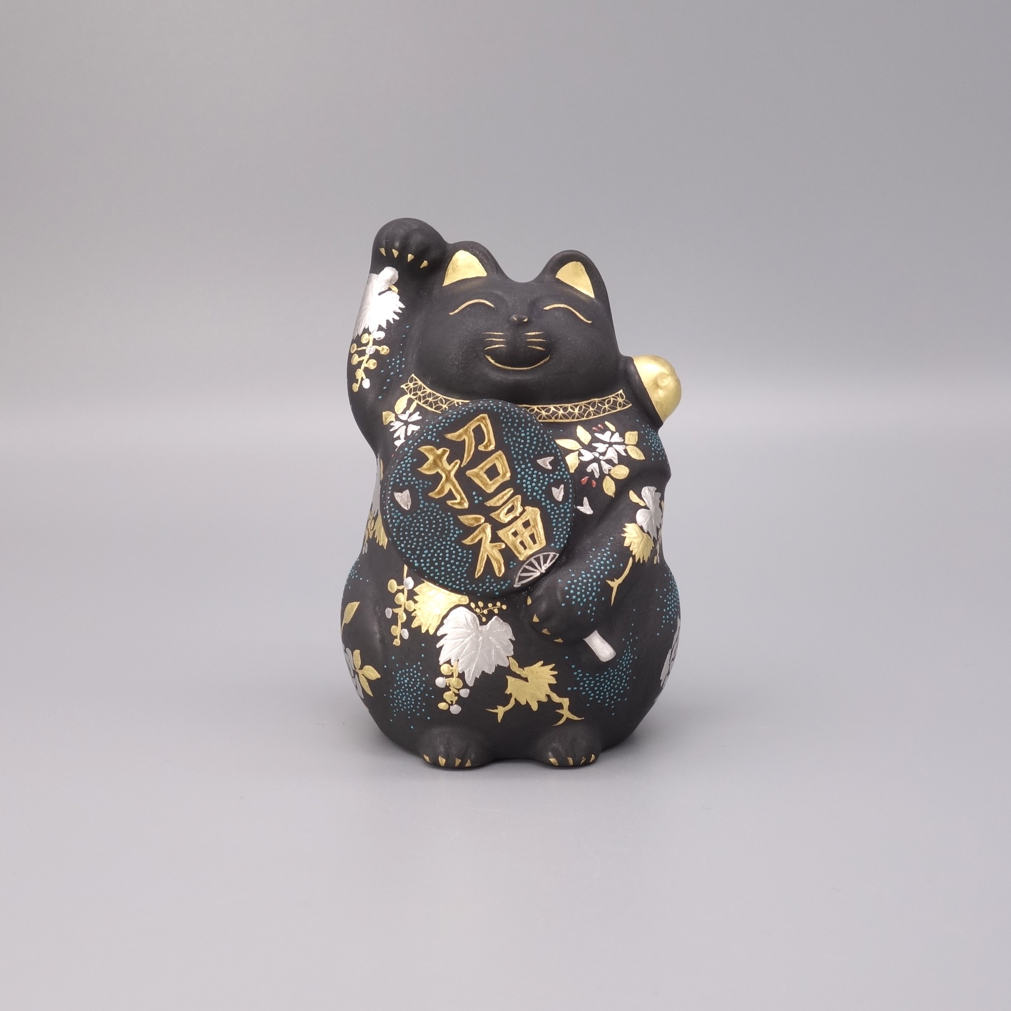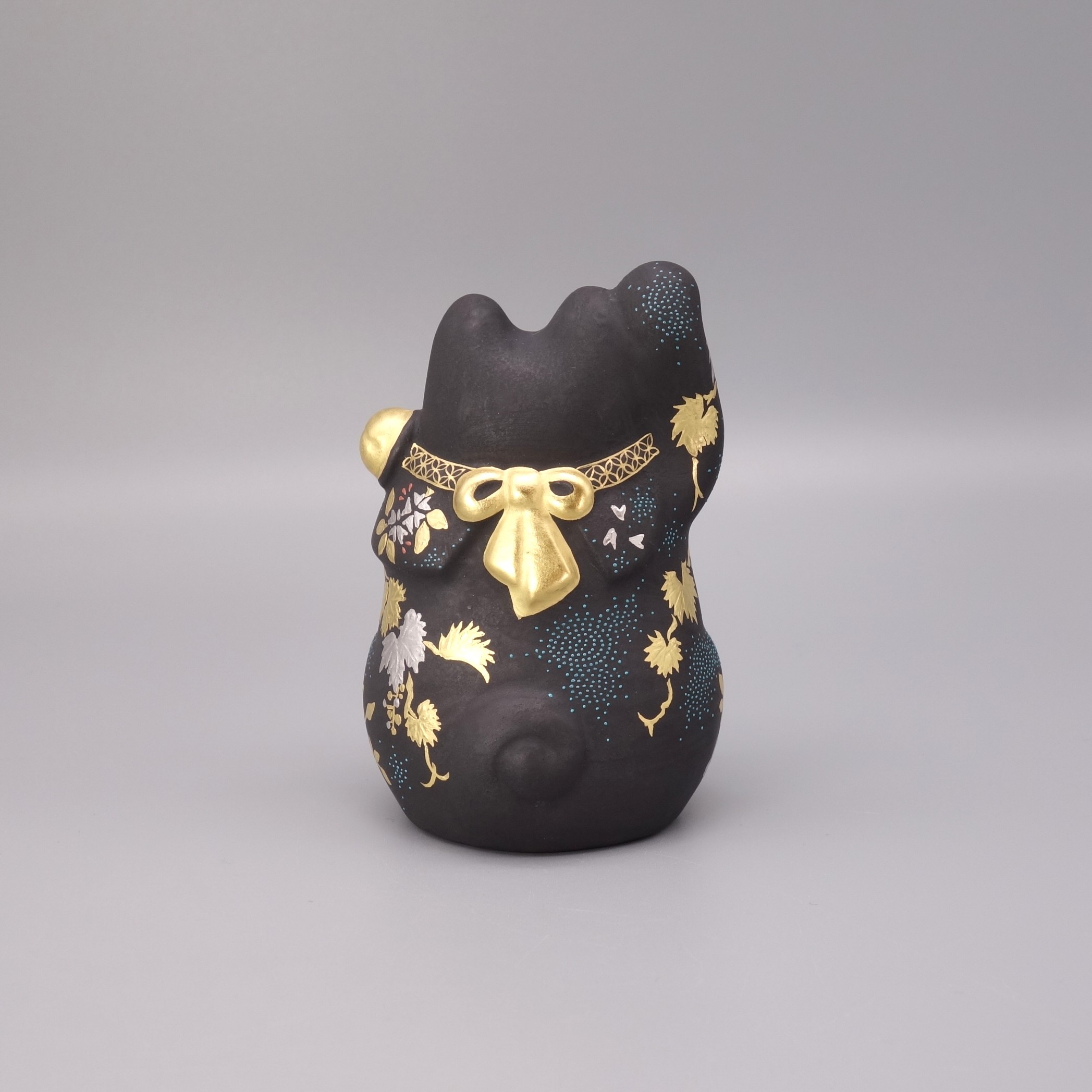 渦打青粒の名手 [ 三代 仲田錦玉 ] によって仕上げられた3.5号(高さ10.8cm)「招猫」です。 型で制作された左団扇の素地に青地の下地を施し、「葡萄・桜・牡丹」を金盛と白金(プラチナ)で描き、それらを引き立たせるように渦打青粒を絶妙なバランスで配しております。 また、右手を挙げており「金運・幸運を招く」と言われております。 縁起の良い 正に逸品です。 付属品 台・木札