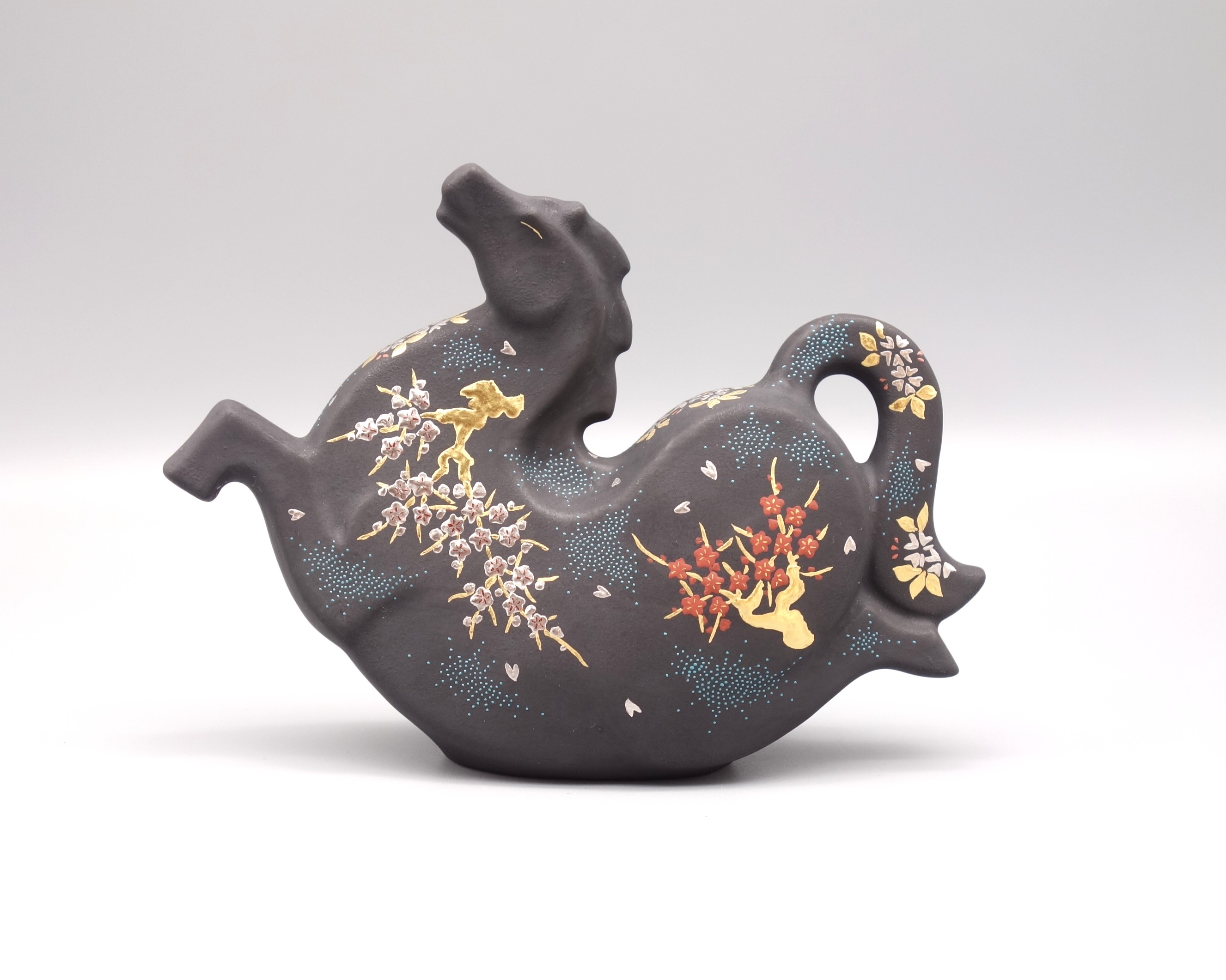 | 製品名: | 九谷焼縁起干支置物 瑞馬 白金盛渦打青粒枝垂桜梅文(木札付) [桐箱入] |