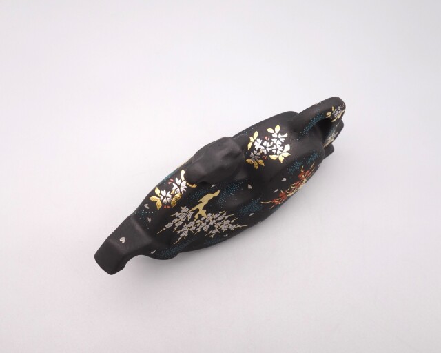 渦打青粒の名手 [ 三代 仲田錦玉 ] によって仕上げられた5.5号(幅17cm)「縁起干支 瑞馬」です。 型で制作された左団扇の素地に青地の下地を施し、「枝垂桜」を金盛と白金(プラチナ)で「紅梅」を金盛と赤盛でそれぞれ描き、それらを引き立たせるように渦打青粒を絶妙なバランスで配しております。 付属品 木札