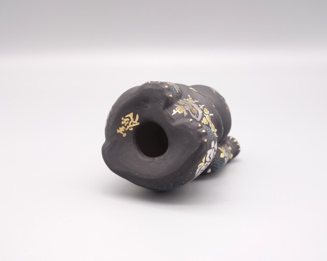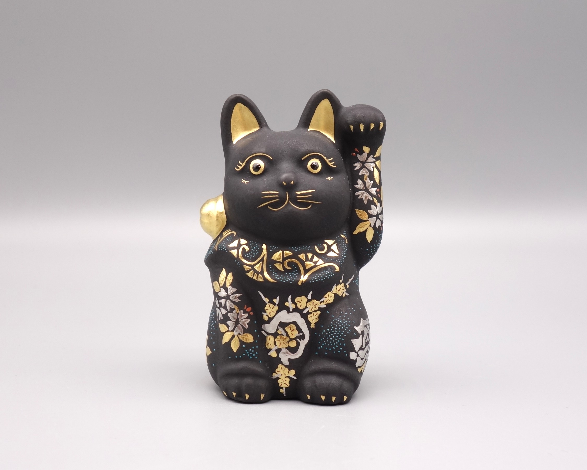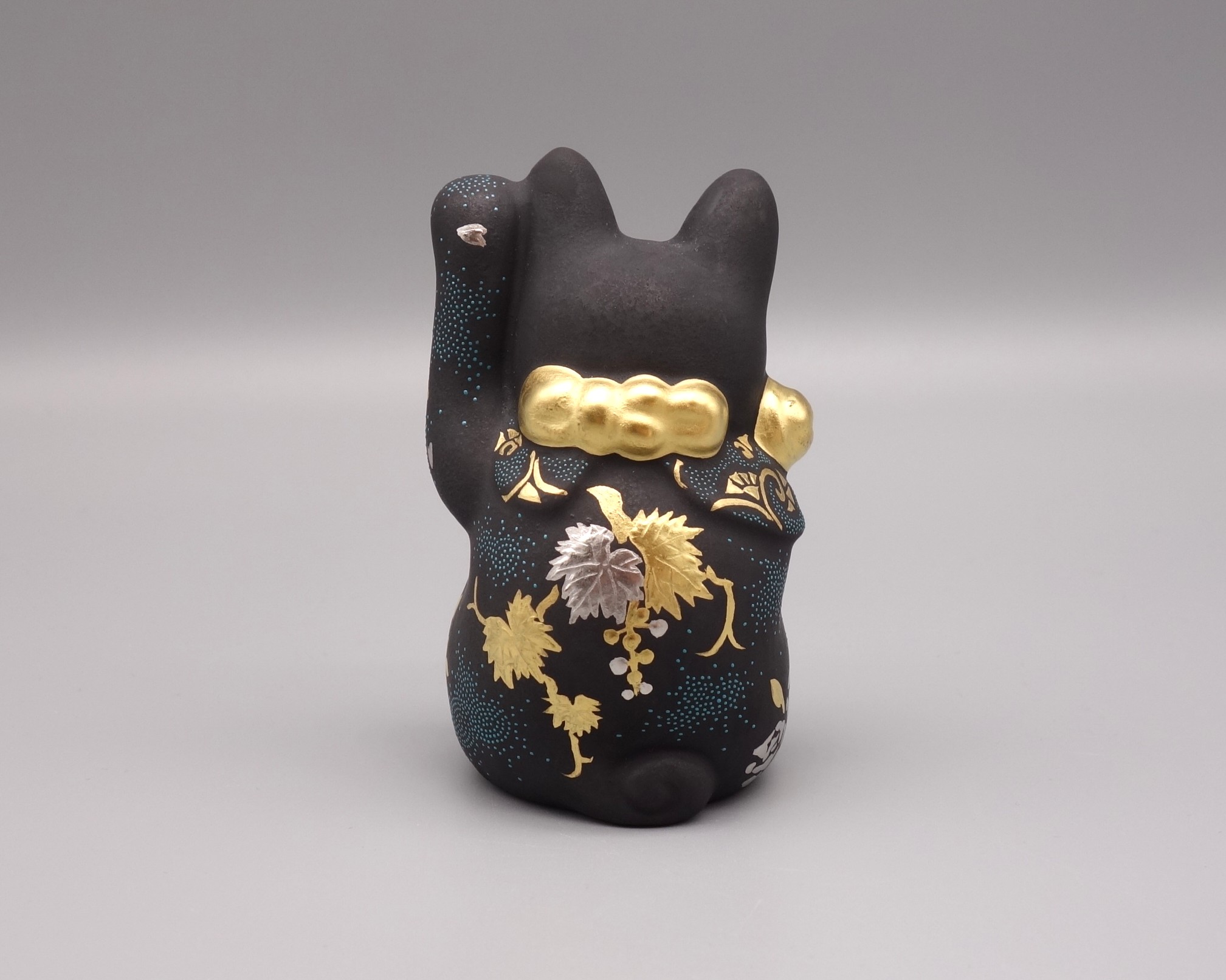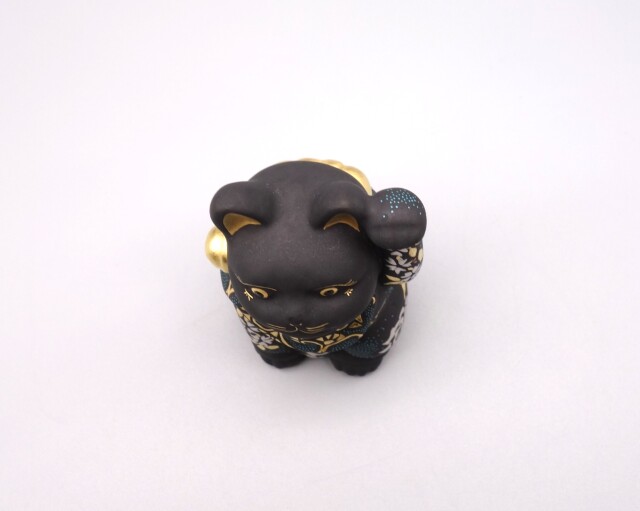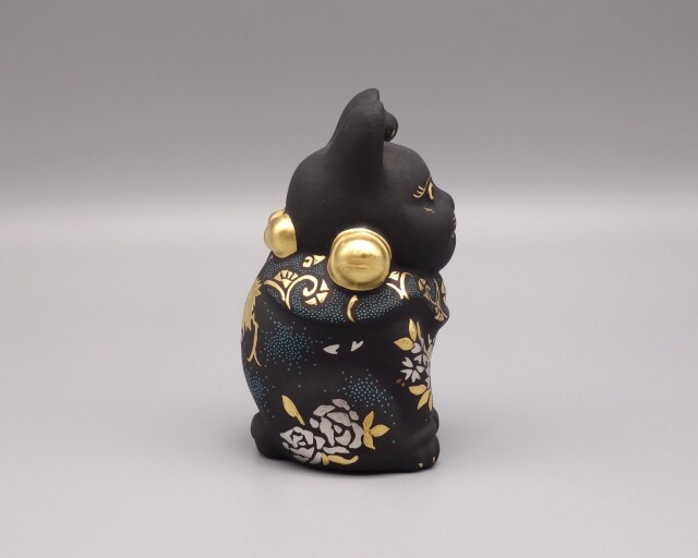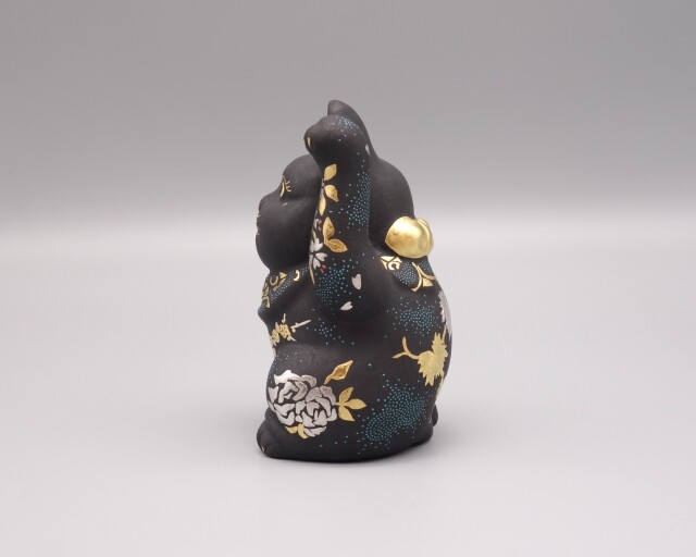 渦打青粒の名手 [ 三代 仲田錦玉 ] によって仕上げられた(高さ10cm)「招猫」です。 型で制作された素地に青黒地を施し、前面に「枝垂桜・梅・牡丹」を背面に「葡萄」を金盛と白金(プラチナ)で描き、それらを引き立たせるように渦打白粒を絶妙なバランスで配しております。 また、左手を挙げており「人運・お客様を招く」と言われております。 縁起の良い 正に逸品です。 付属品 台・木札