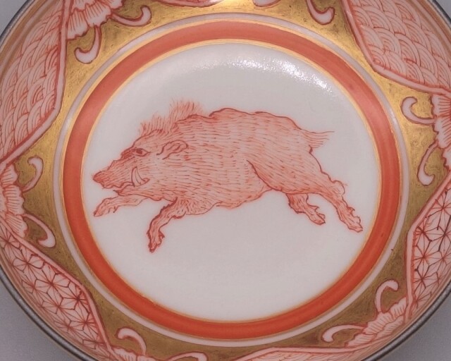 赤絵細描で渕面を仕上げ、中面に 亥 を赤の線の濃淡で描き切っております。