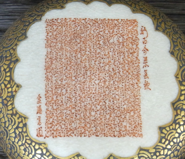 丸型の手挽きの素地に、蓋の上面と下面に毛筆細字で「新古今集」を筆っし、本金小紋で仕上げをしております。非常に貴重な逸品です。