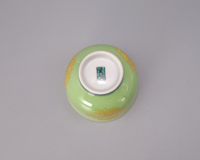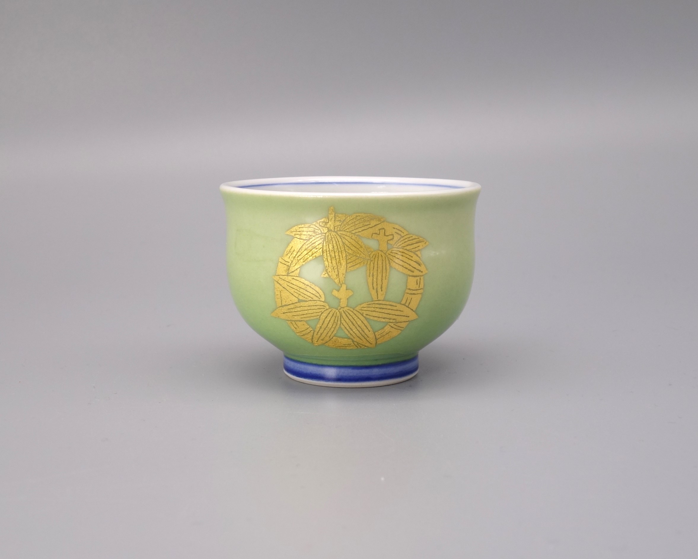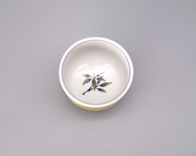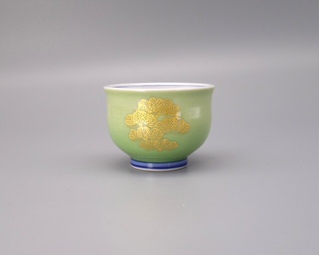 九谷が誇る人間国宝保持者 [吉田美統 ] 先生の新作の「ぐい呑」です。 今回の作品は高貴な「緑」をベースに先生の代表的画風である釉裏金彩で「竹と松」を見事にあしらってあります。花びらの一枚一枚、葉、枝の部分全て手作業で貼りう付けられており、また細部にまで綿密に計算され濃淡などを表現しております。 また中面には色絵で「笹」が描かれております。