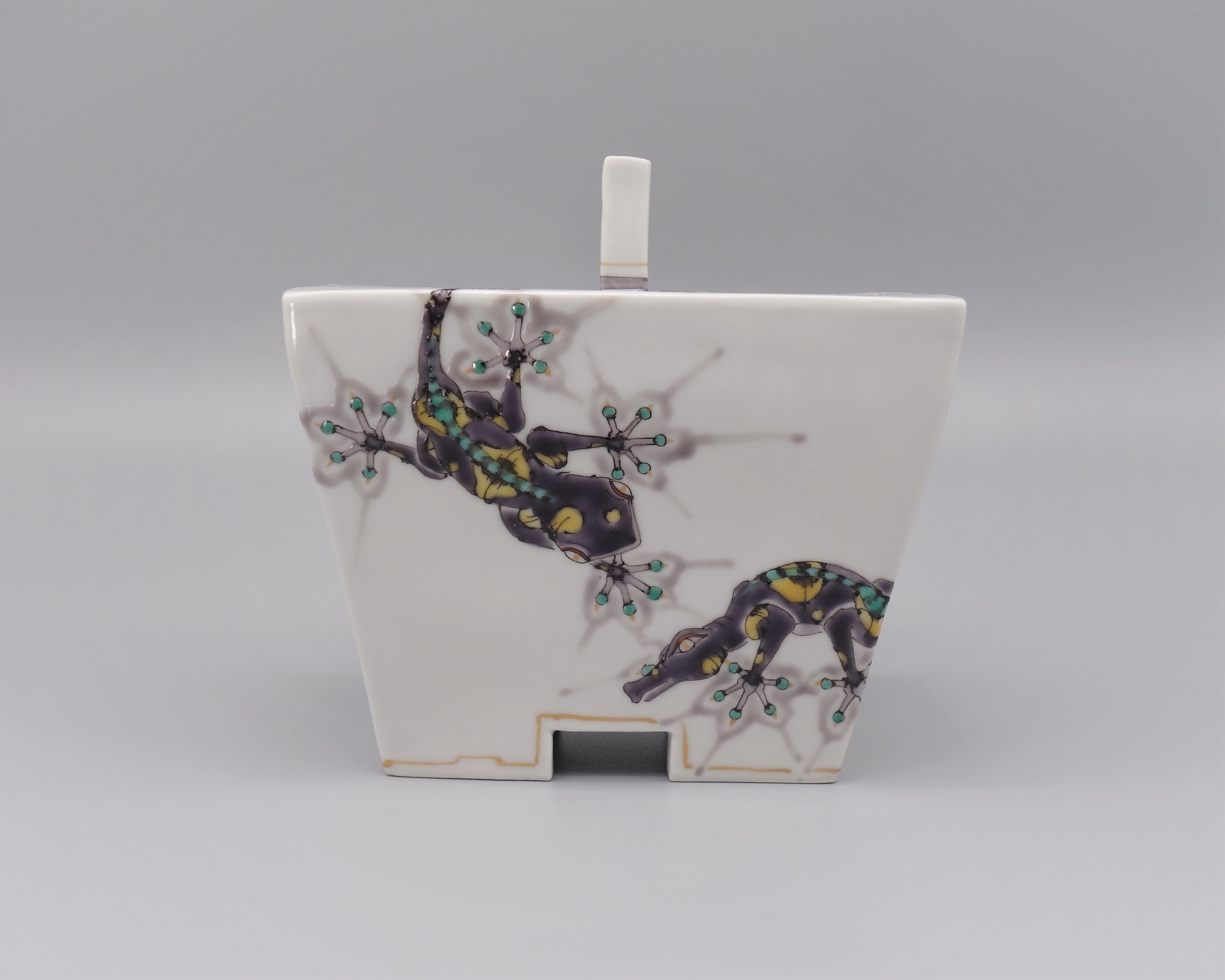 新進気鋭の作家・山近泰が独特のタッチで作った新作の「香炉(角タタラ)」です。 山近泰といえば「神象」と言われておりますが・・・今回の新作は家守。 人間に身近な存在で、人家内外の害虫を捕食することから家を守るとされ、漢字では「家守」と書かれ縁起物として大切にする風習もある。 また、裏面は家守を腹側から描きユーモラスな仕上がりになっております。 第35回・43回伝統九谷焼工芸展 大賞受賞作家!
