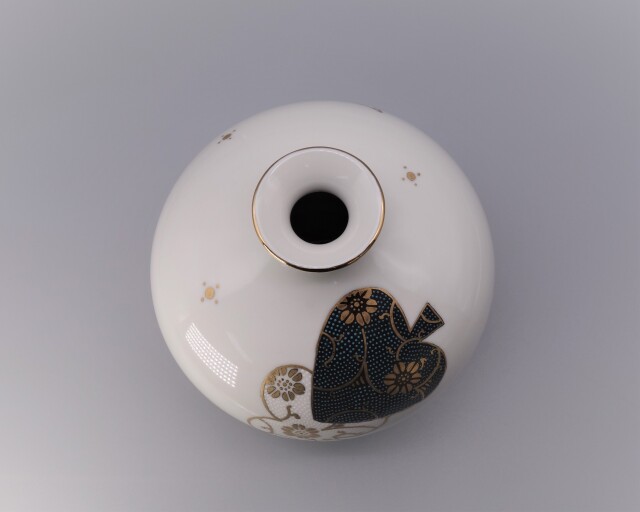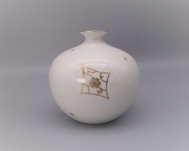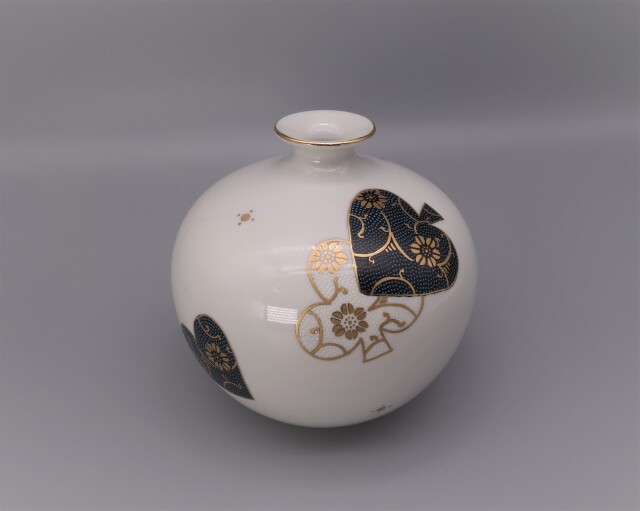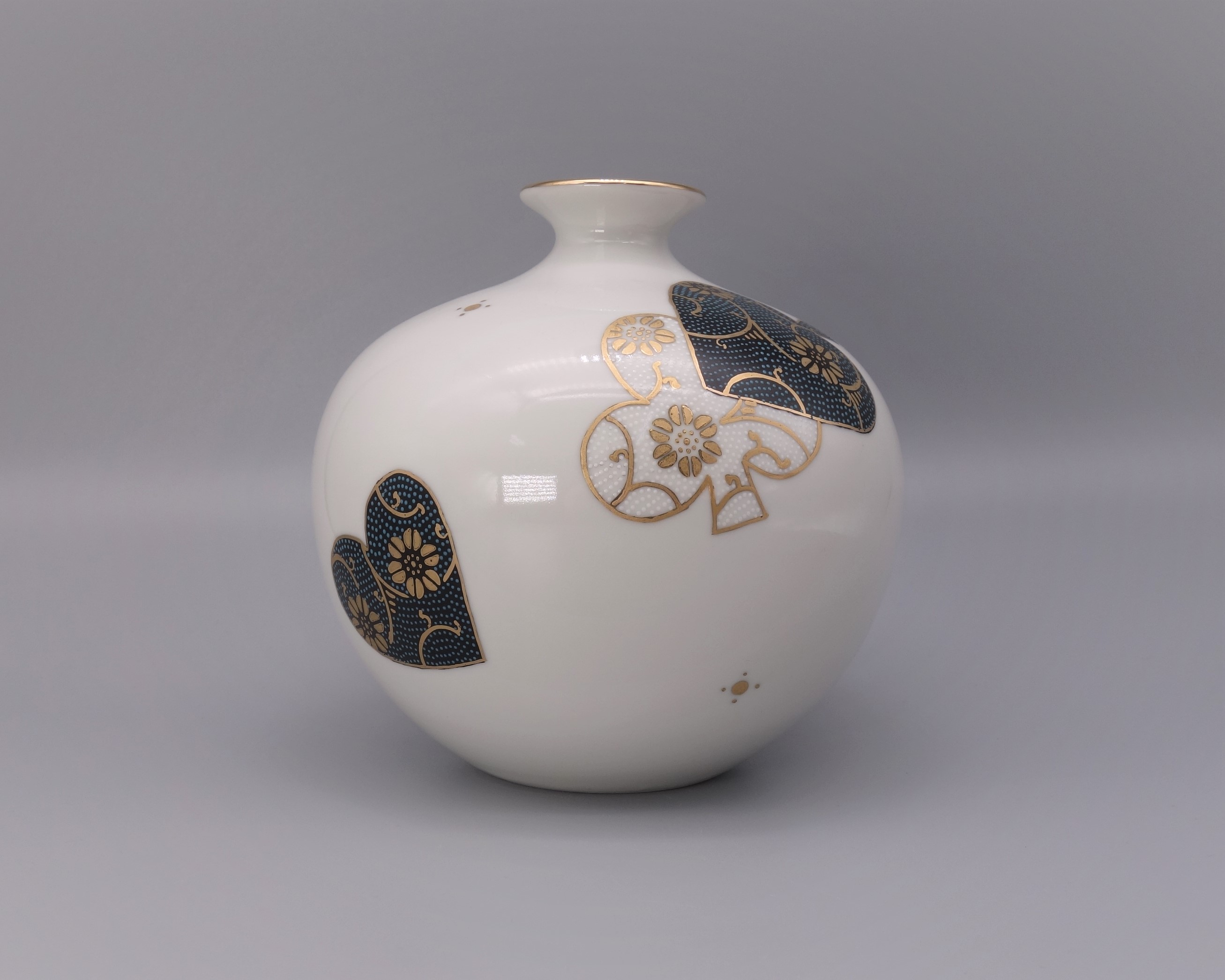 九谷の伝統的絵柄の「青粒/白粒」で描かれた華器(5号)です。 当店の職人によって、トランプ柄に間取りされ、それぞれ青粒(アオチブ)と白粒(シロチブ)を一粒一粒丹念に粒を打ち込んでおります。また鉄仙等は「金盛」という技法を用いて鉄線の花の部分を盛り上げるよう仕上げており、これによって一層立体感が増し金色も上品な光を放つようになります。