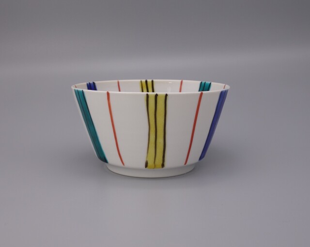 こどもの器で有名な女性作家・村田菜穂美の「フリーボウル」です。 独特の切立の素地は小野内俊夫の手挽きで軽量化しております。 色とりどりの線を「十草」の紋様を描き仕上げに色絵を施しております。 可愛い風合いが嬉しいお気に入りの器です。